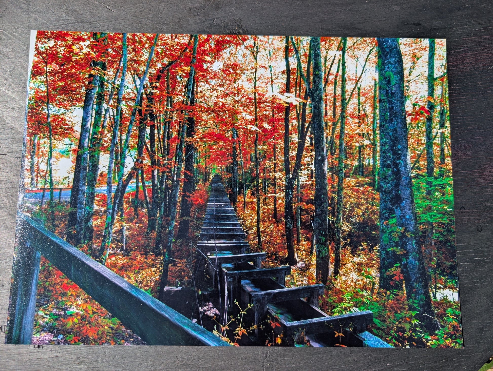 Beautiful Fall landscape print, what a breath taking view! Beautiful wooden walkway with fall foliage in the mountains off the Blue Ridge Parkway in Virginia. Ready to frame to your liking.