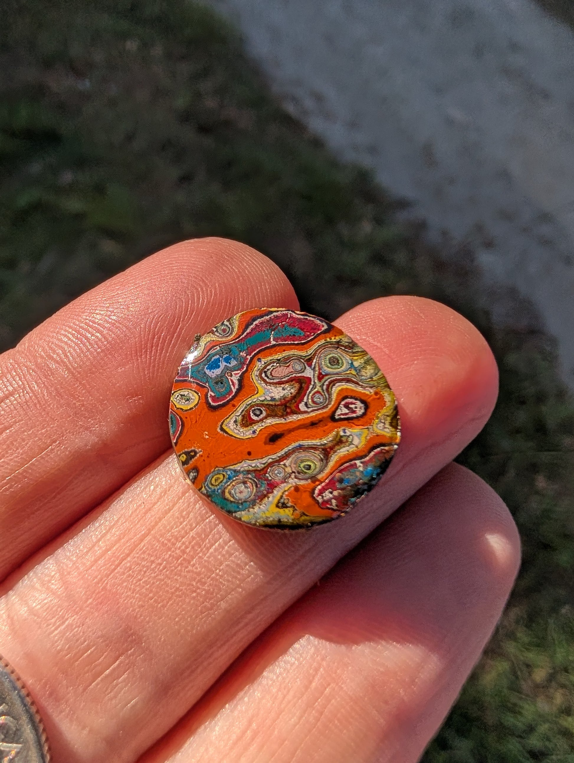 Gorgeous small Cabochon made with fallen paint from tag art and street art and processed and epoxied to protect the paint and strengthen the durability to be used in jewlery making. These pieces are unique and one of a kind, perfect for your next creation. These cabochons have been backed with a 1 gram silver coin .99 silver. ( with the epoxy please avoid high heats, your typical heat gun should be just fine but no kiln or torches).