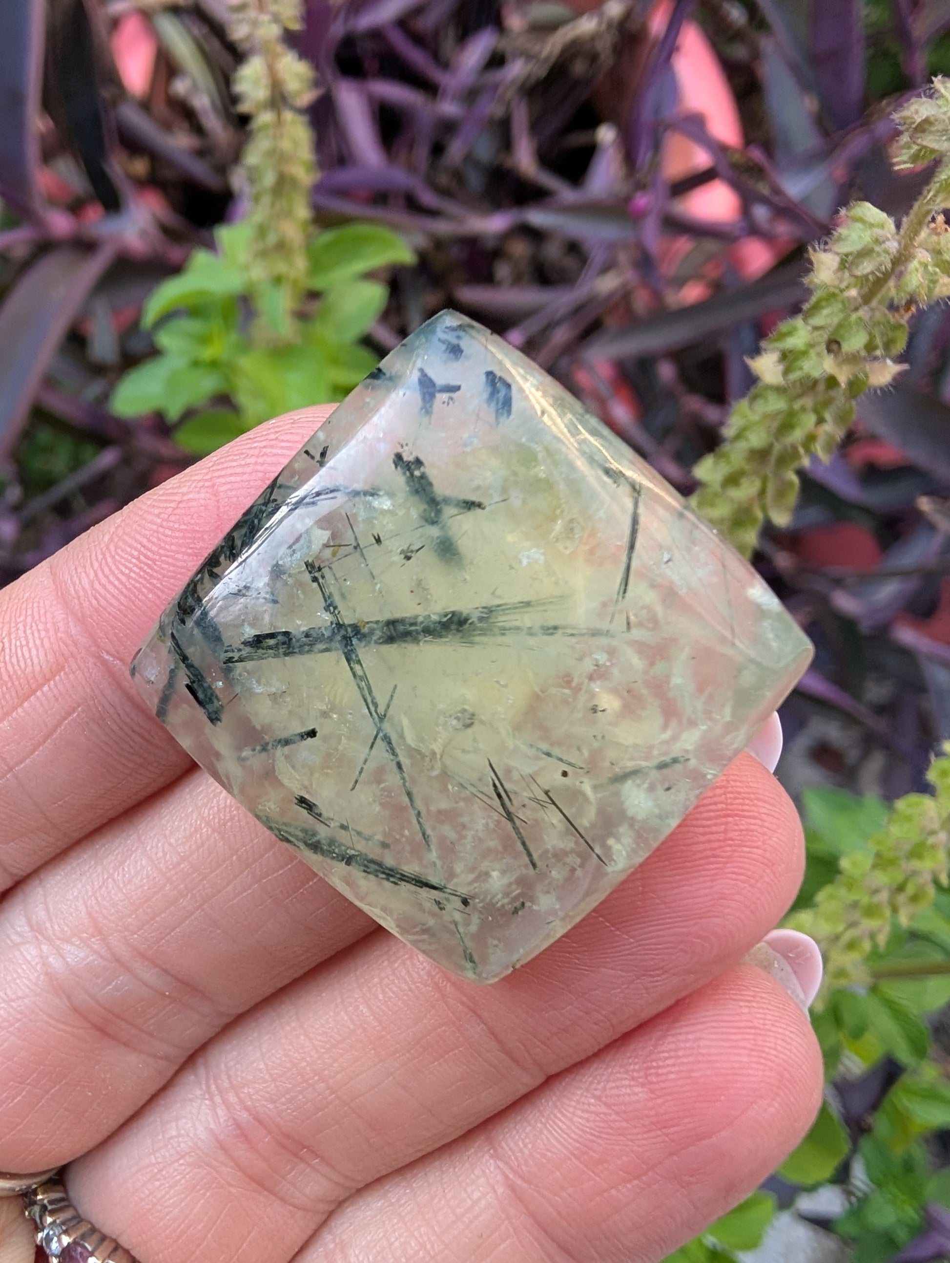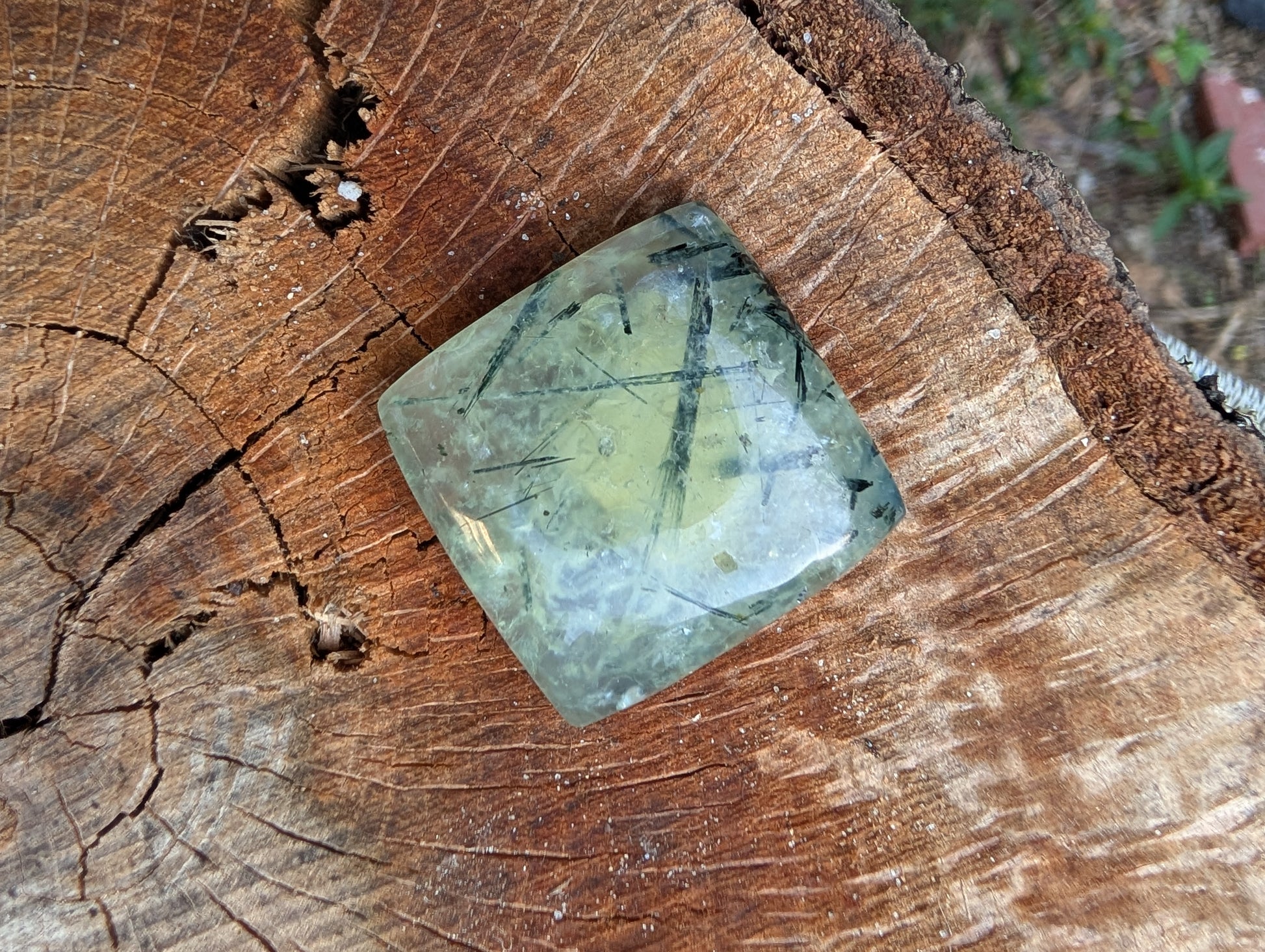 Stunning piece of Phrenite. Beautiful green colors. The coloration of these phrenite with Epidote sprays are so bright and springy. These cabs are full of life! This particular Cabochon weighs a total of 15.7grams and measures approximately 30mm top to bottom and 29mm side to side. Nice square shape. These eye catching cabochons will make gorgeous center pieces for Jewlery making or whatever your creation may be! What you see is what you get, no random grabs, you will recieve the cabochon pictured if purchased. All pieces are packaged and shipped with eco friendly materials.