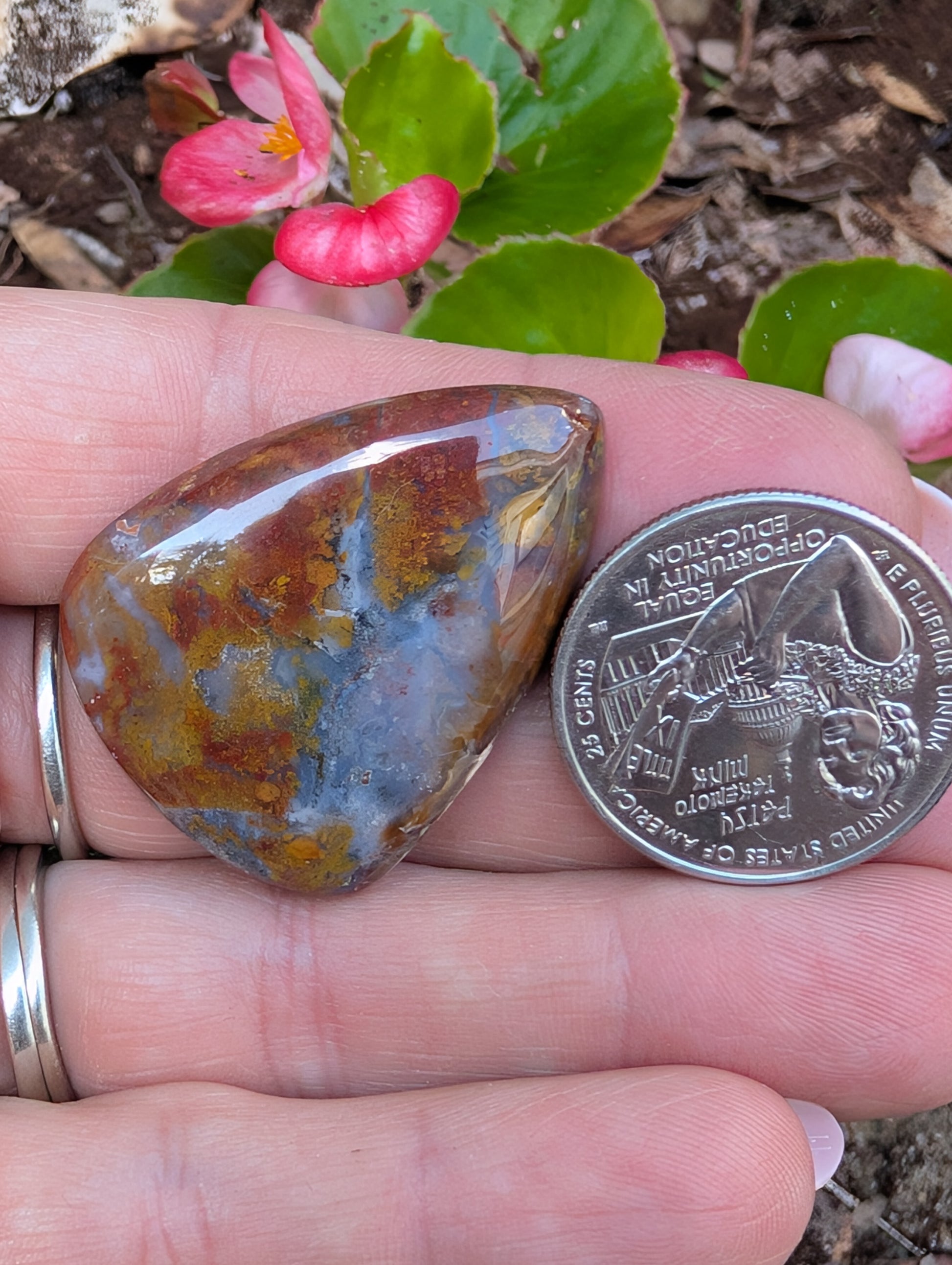 Stunning piece of Plume Agate. Beautiful color pattern and red tones. The coloration of this cab reminds me of swirls of paint! So bright and vibrant, These cabs are full of life! This particular Cabochon weighs a total of 8.8grams and measures approximately 36mm top to bottom and 27mm side to side. Nice tear drop shape. These eye catching cabochons will make gorgeous center pieces for Jewlery making or whatever your creation may be! What you see is what you get, no random grabs, you will recieve the cabochon pictured if purchased. All pieces are packaged and shipped with eco friendly materials.