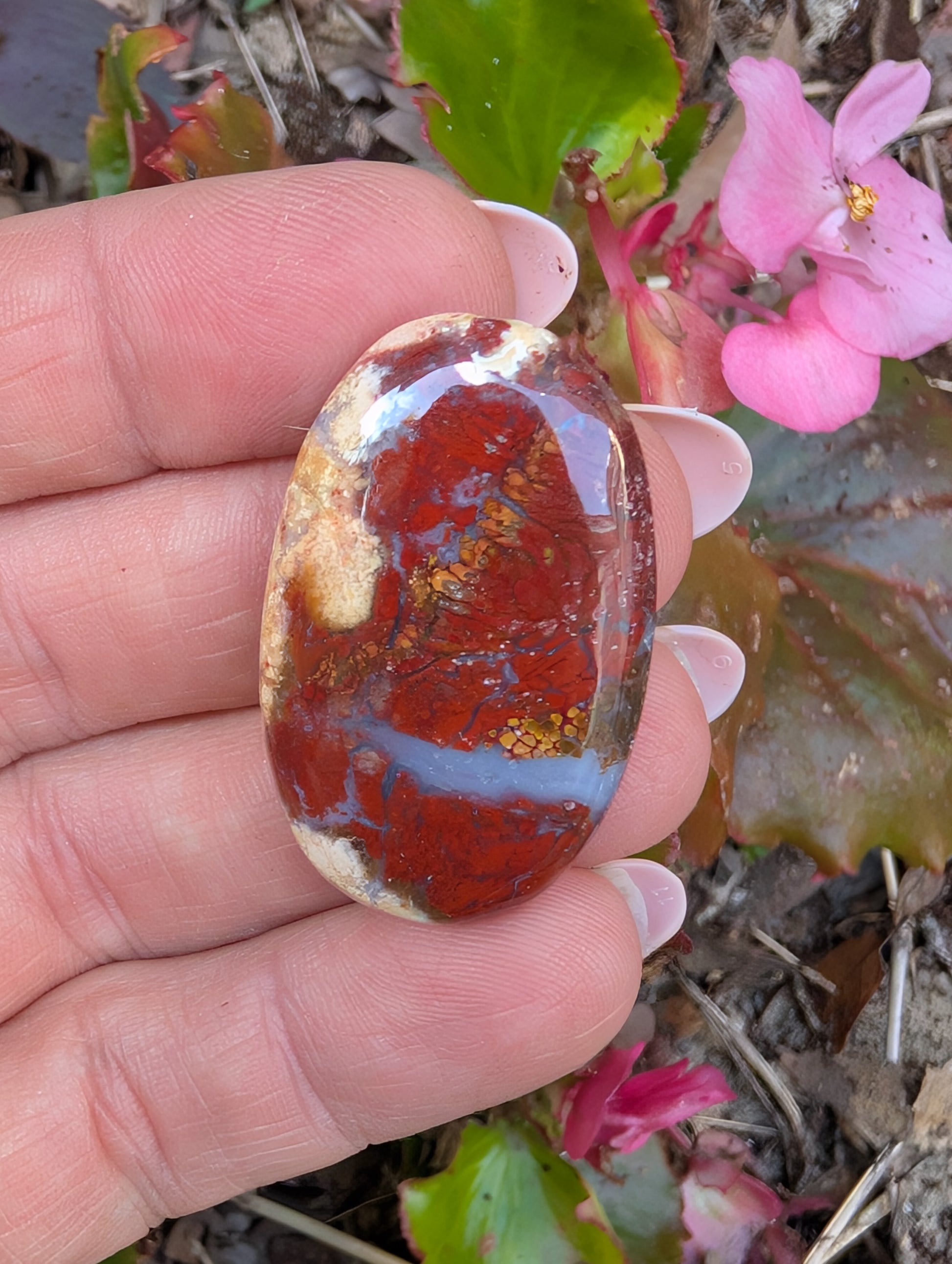 Plume agate cabochon. Oval . Red 36mm x 23mm